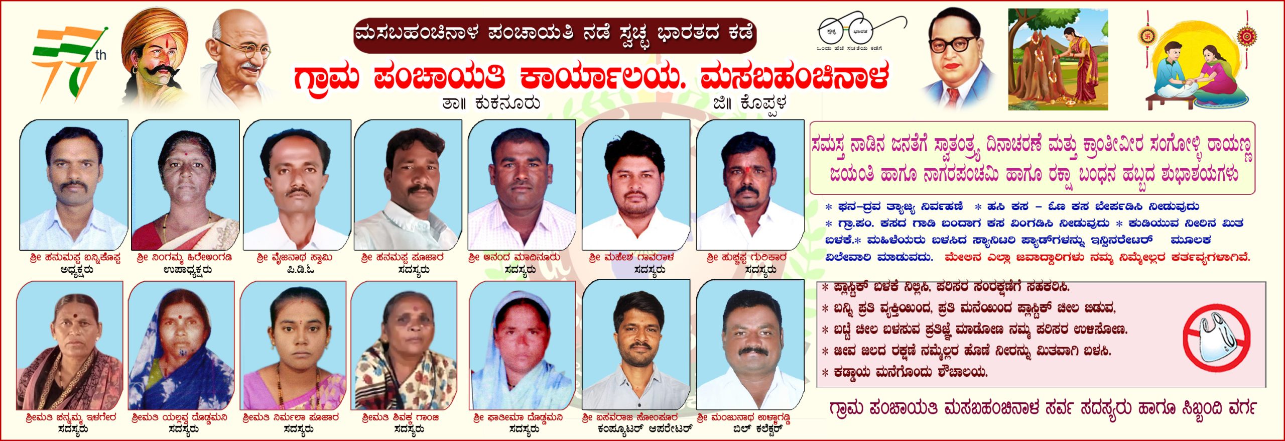 ಶುಭ ಕೋರುವವರು : ಅಧ್ಯಕ್ಷರು,ಉಪಾಧ್ಯಕ್ಷರು,ಪಿಡಿಓ ಹಾಗೂ ಸರ್ವಸದಸ್ಯರು ಹಾಗೂ ಸಿಬ್ಬಂದಿ ವರ್ಗ, ಗ್ರಾಮ ಪಂಚಾಯತಿ ಕಾರ್ಯಾಲಯ ಮಸಬಹಂಚಿನಾಳ .