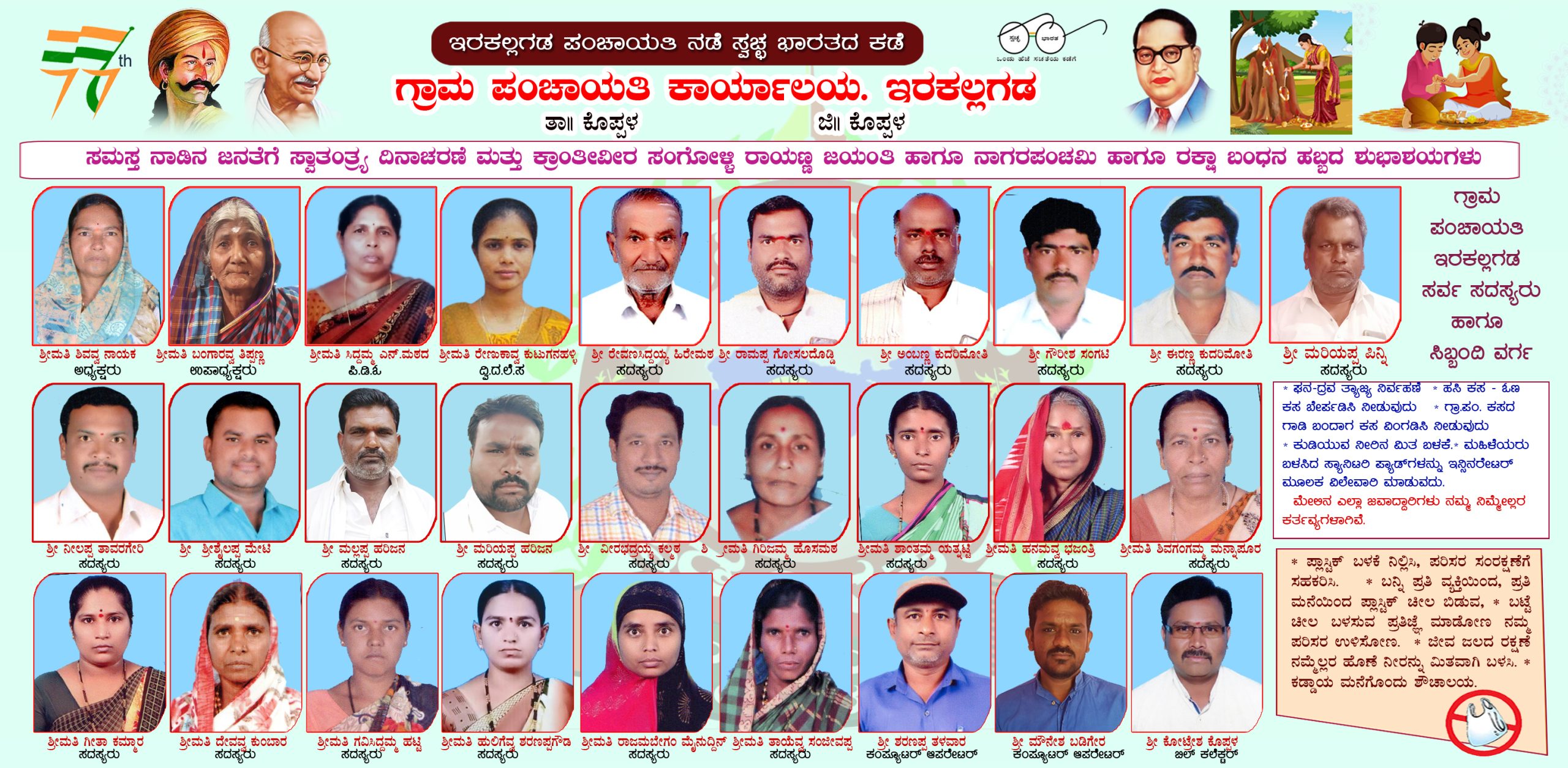 ಶುಭ ಕೋರುವವರು : ಅಧ್ಯಕ್ಷರು,ಉಪಾಧ್ಯಕ್ಷರು,ಪಿಡಿಓ ಹಾಗೂ ಸರ್ವಸದಸ್ಯರು ಹಾಗೂ ಸಿಬ್ಬಂದಿ ವರ್ಗ, ಗ್ರಾಮ ಪಂಚಾಯತಿ ಕಾರ್ಯಾಲಯ ಇರಕಲ್ಲಗಡ.