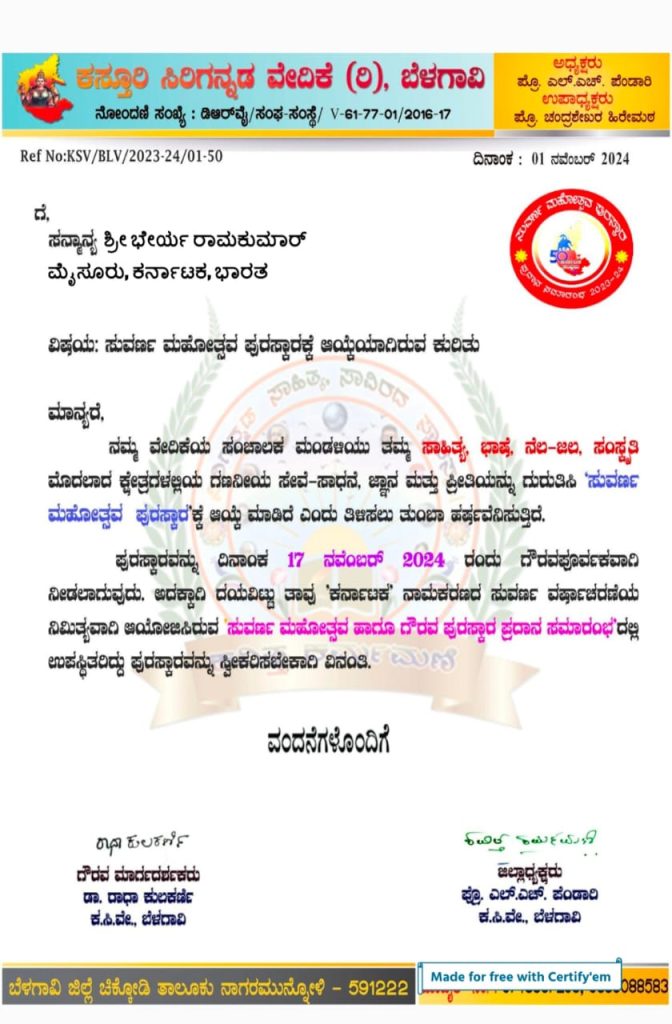 ಮೈಸೂರಿನ ಹಿರಿಯ ಸಾಹಿತಿ , ಪತ್ರಕರ್ತ, ಕನ್ನಡಪರ ಚಿಂತಕ ಹಾಗೂ ಪರಿಸರ ಪ್ರೇಮಿ ಡಾ.ಭೇರ್ಯ ರಾಮಕುಮಾರ್ ಅವರು ಬೆಳಗಾವಿಯ ಕಸ್ತೂರಿ ಸಿರಿಗನ್ನಡ ವೇದಿಕೆಯು ನೀಡುವ ಸುವರ್ಣ ಮಹೋತ್ಸವ ಪುರಸ್ಕಾರಕ್ಕೆ ಆಯ್ಕೆ ಆಗಿದ್ದಾರೆ.